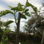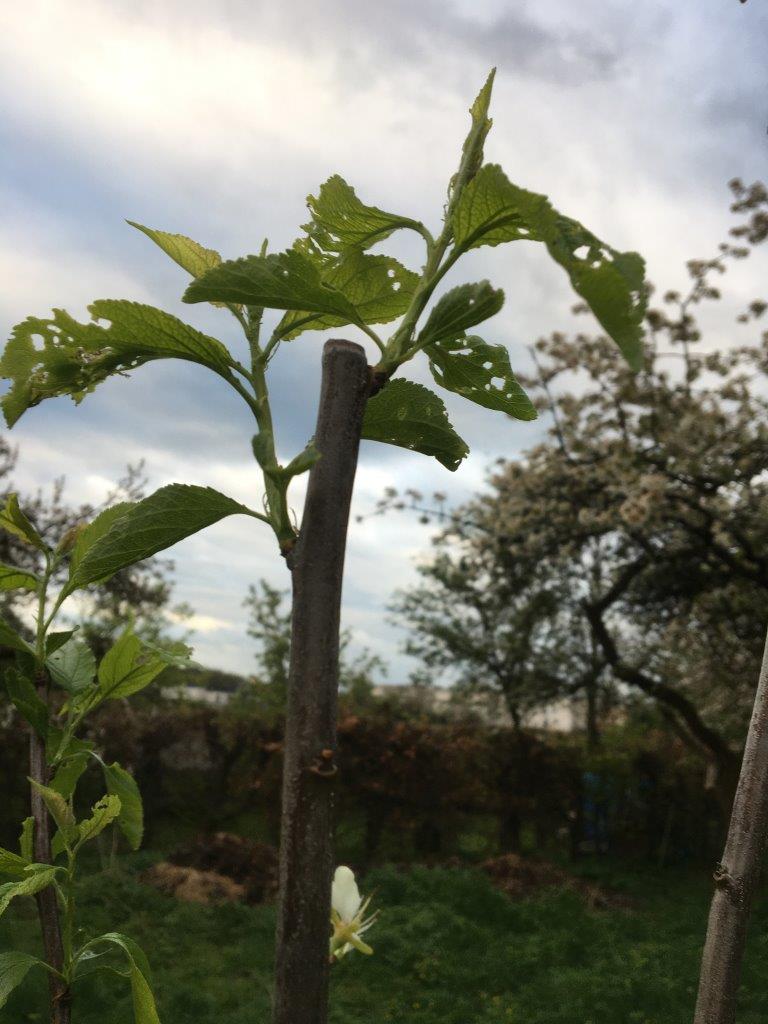 Ersatzpflanzung auf einer Streuobstwiese zwischen zwei schon vor Jahren aus Altersgründen abgestorbenen Kirschbäumen. Über die gerade ausgetriebenen Blätter haben sich schon irgendwelche Knabbertierchen gefreut. Siehe Foto unten.
